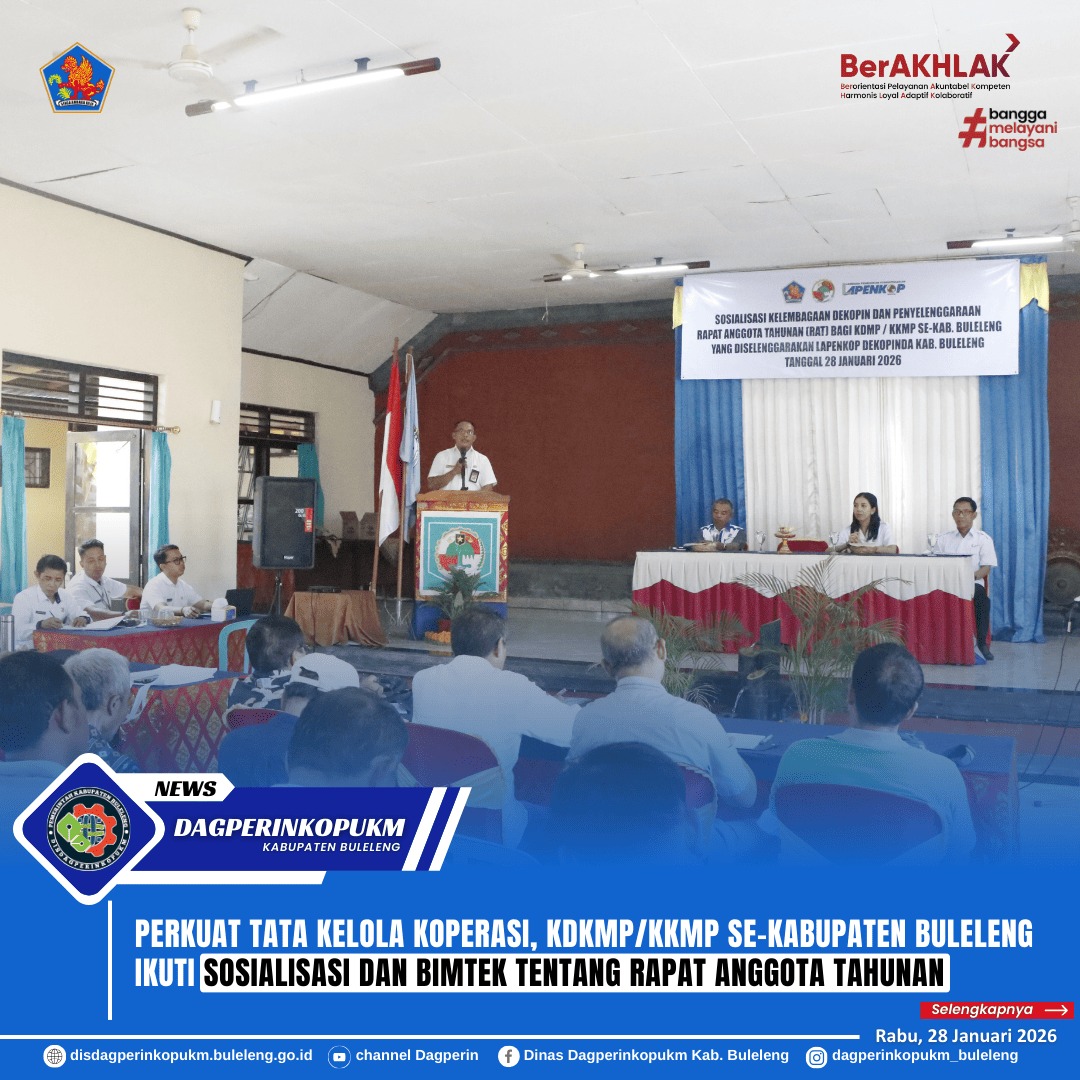 Singaraja, 28 Januari 2026 - Kepala Dinas Dagperinkopukm Kabupaten Buleleng Dewa Made Sudiarta menghadiri undangan Pengenalan Dewan Koperasi Indonesia Daerah (Dekopinda) Kabupaten Buleleng yang dirangkaikan dengan Sosialisasi Regulasi tentang Pelaksanaan Rapat Anggota Tahunan (RAT) KDMP/KKMP se-Kabupaten Buleleng. Kegiatan dilaksanakan di Gedung Dekopinda Buleleng, Rabu (28/1). Acara ini bertujuan untuk meningkatkan pemahaman pengurus koperasi terhadap ketentuan RAT serta memperkuat peran kelembagaan Dekopinda di daerah.