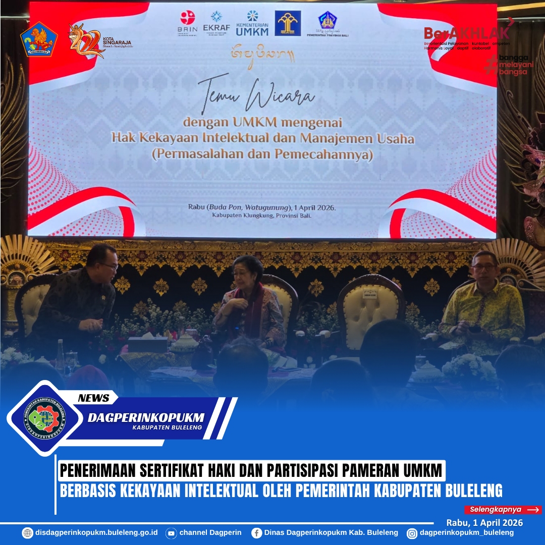 Klungkung, 1 April 2026 - Sekretaris Dinas Dagperinkopukm Kabupaten Buleleng, I Made Sudarmika, bersama Kepala Bidang Pemberdayaan Usaha Mikro, Kepala UPTD PLUT-KUMKM Buleleng, serta staf teknis menghadiri acara Penyerahan Sertifikat Hak Kekayaan Intelektual (HAKI) Provinsi Bali Tahun 2026 yang dirangkaikan dengan kunjungan ke Pameran UMKM berbasis Kekayaan Intelektual. Kegiatan ini dilaksanakan di Balai Budaya Ida Dewa Agung Istri Kanya, Kabupaten Klungkung, pada Selasa (1/4).