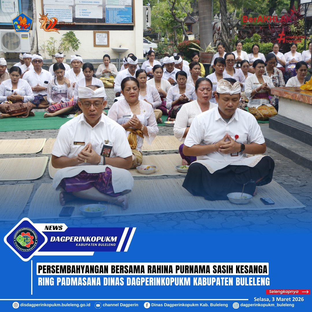 Singaraja, 3 Maret 2026 - Bertepatan dengan Rahina Purnama Sasih Kesanga, seluruh pegawai lingkup Dinas DagperinkopUKM Kabupaten Buleleng melaksanakan persembahyangan bersama di Padmasana Dinas DagperinkopUKM pada hari, Selasa (3/3/2026).