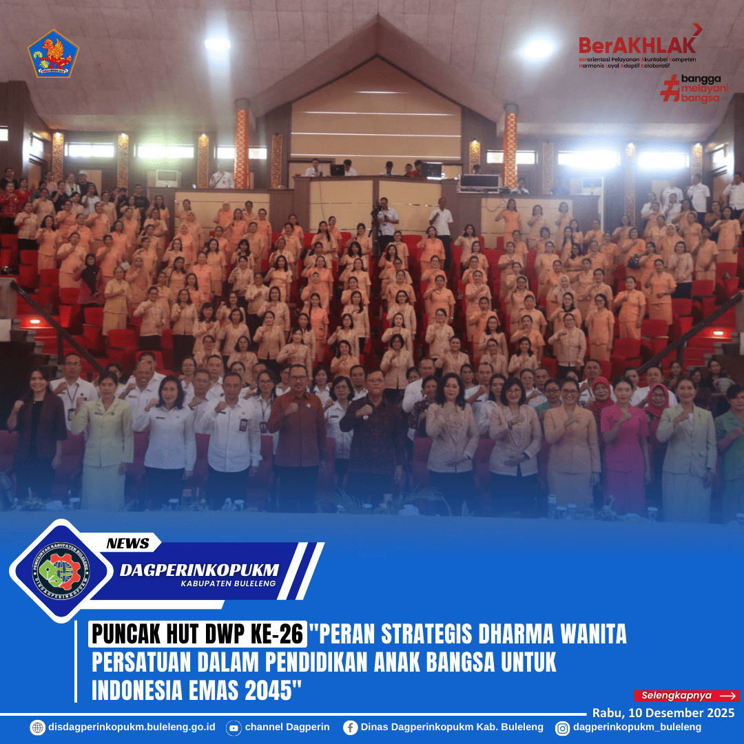 Mewakili Kepala Dinas Dagperinkopukm Buleleng, Sekretaris Dinas I Made Sudarmika beserta Ibu Ketua DWP Dinas Dagperinkopukm Kabupaten Buleleng Ny. Sri Sundariani Sudiarta bersama anggota DWP hadir pada acara Puncak Peringatan HUT Dharma Wanita Persatuan ke - 26 Tahun 2025. Acara dipusatkan di Gedung Kesenian Gde Manik Singaraja, Rabu (10/12).