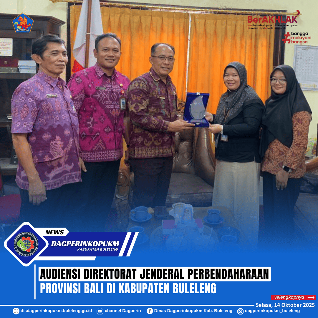 Kadis DagperinkopUKM Kab. Buleleng Drs. Dewa Made Sudiarta, M.Si didampingi Sekretaris Dinas I Made Sudarmika, M.T menerima Audiensi dari Direktorat Jenderal Perbendaharaan Provinsi Bali terkait Pengembangan Koperasi Desa/Kelurahan Merah Putih di Kabupaten Buleleng, bertempat di Ruang Kepala Dinas Dagperinkopukm Kab. Buleleng, Selasa (14/10).