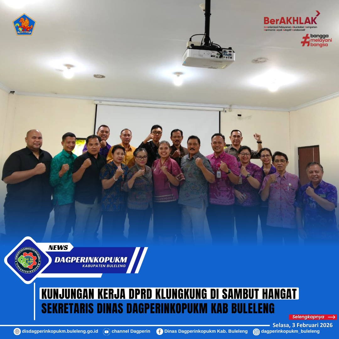 Singaraja, 3 Februari 2026 - Sekretaris Dinas Dagperinkopukm Kab. Buleleng Made Sudarmika menyambut dengan hangat kedatangan rombongan Komisi III DPRD Kab. Klungkung dalam rangka kunjungan kerja. Kedatangan rombongan Komisi III DPRD Kab. Klungkung diterima di Gedung PLUT K-UMKM Kab. Buleleng pada, Selasa (3/2).