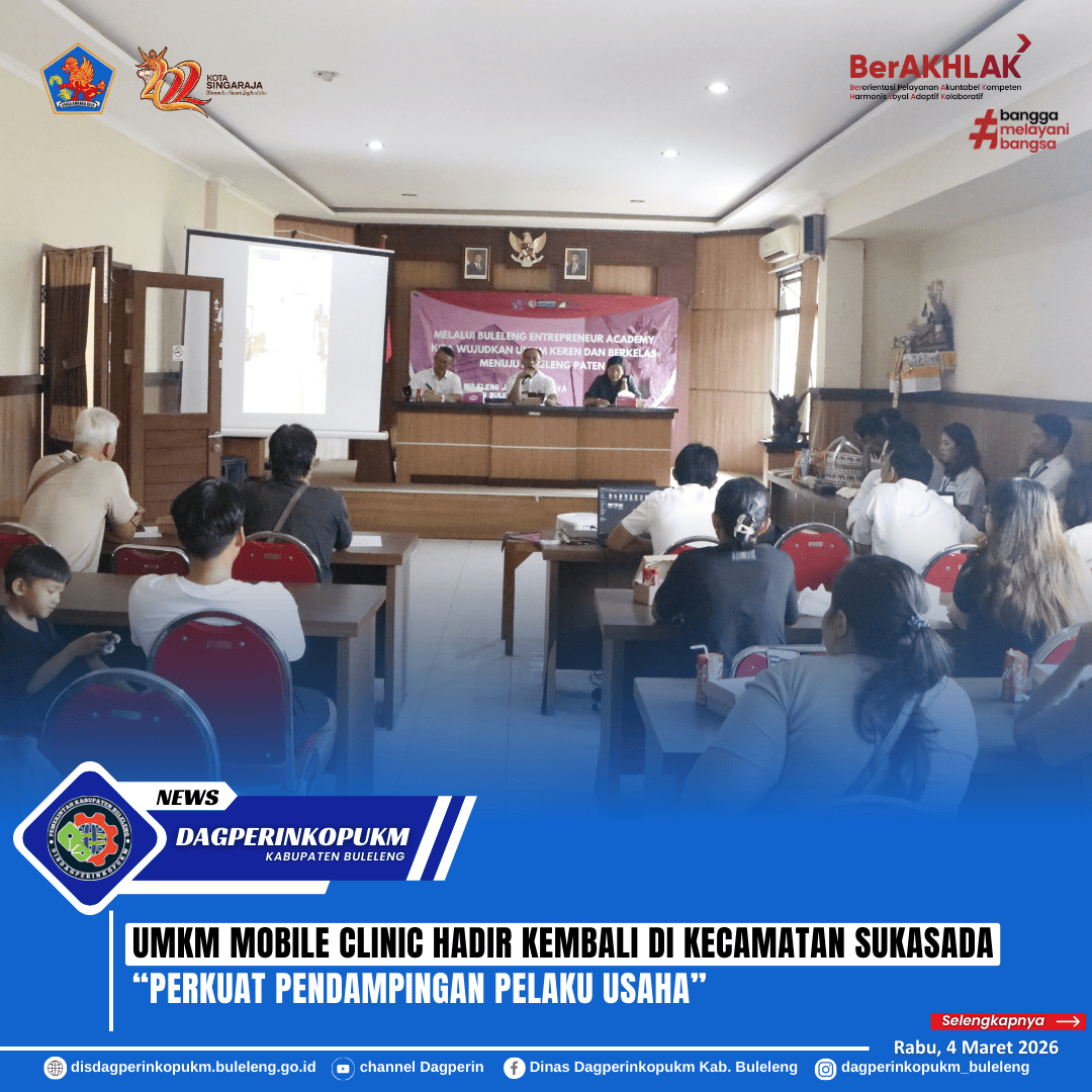 UMKM Mobile Clinic kembali dilaksanakan oleh Dinas Dagperinkopukm Kabupaten Buleleng bersama pendamping dari UPTD PLUT KUMKM Buleleng. Pada kesempatan kali ini, kegiatan berlangsung di Kantor Camat Sukasada, Rabu (4/3).