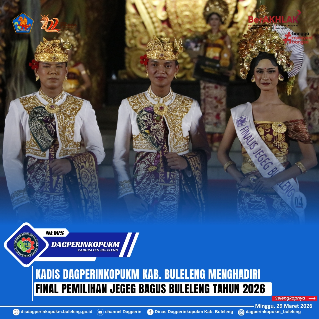 Singaraja, 29 Maret 2026 - Kepala Dinas Dagperinkopukm Kab Buleleng Dewa Made Sudiarta menghadiri undangan Malam Grand Final Jegeg Bagus Buleleng tahun 2026 yang berlangsung RTH Taman Bung Karno, Minggu (29/3).