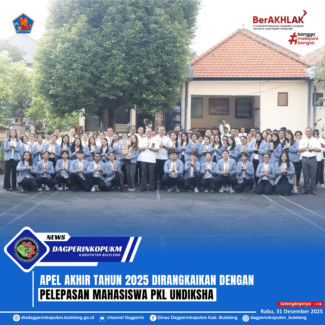 Menutup rangkaian aktivitas kerja di penghujung Tahun 2025, jajaran pegawai Dinas Dagperinkopukm Kab. Buleleng melaksanakan apel hari terakhir tahun 2025 yang berlangsung dengan khidmat di halaman kantor, Rabu (31/12/2025). Apel ini menjadi momentum refleksi atas pelaksanaan program dan kinerja selama satu tahun sekaligus penguatan semangat menyongsong tahun yang baru.