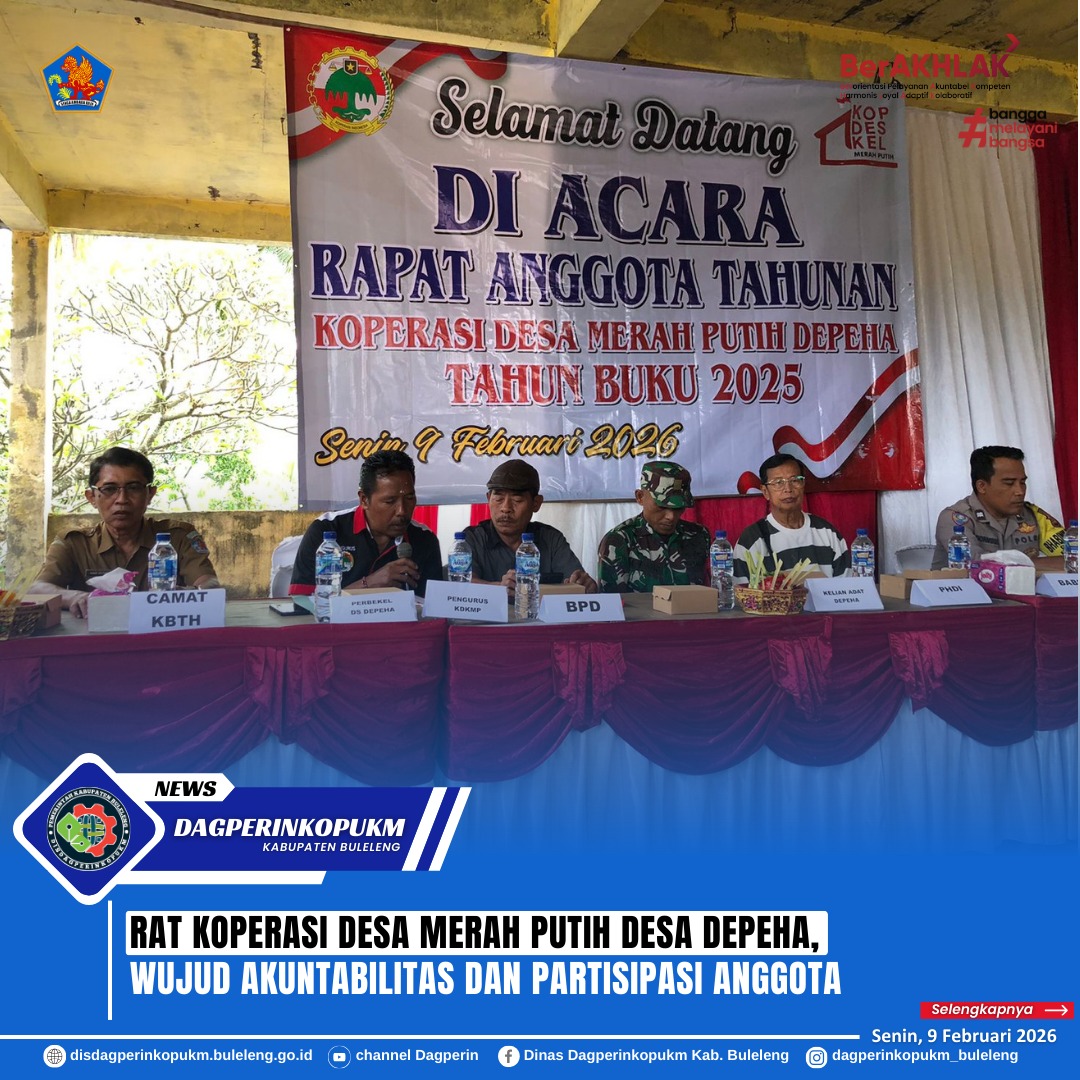 Buleleng, 9 Februari 2026 - Pengawas Koperasi Ahli Muda Hadi Setiadi bersama staf teknis menghadiri RAT Koperasi Desa Merah Putih (KDMP) Desa Depeha, Kec. Kubutambahan. RAT merupakan forum tertinggi dalam koperasi yang berfungsi untuk mengevaluasi kinerja pengurus dan pengawas, menetapkan rencana kerja, serta mengambil keputusan strategis demi keberlangsungan dan kemajuan KDKMP.