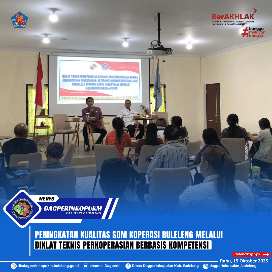 Dalam upaya meningkatkan pengetahuan, keterampilan, dan profesionalisme para pengelola koperasi menuju terciptanya koperasi yang modern dan berkelanjutan, Dinas Perdagangan, Perindustrian, Koperasi, dan UKM Kabupaten Buleleng menyelenggarakan kegiatan Diklat Teknis Perkoperasian berbasis Kompetensi yang dilaksanakan selama tiga hari di PLUT KUMKM Kabupaten Buleleng, Selasa 14/10/2025