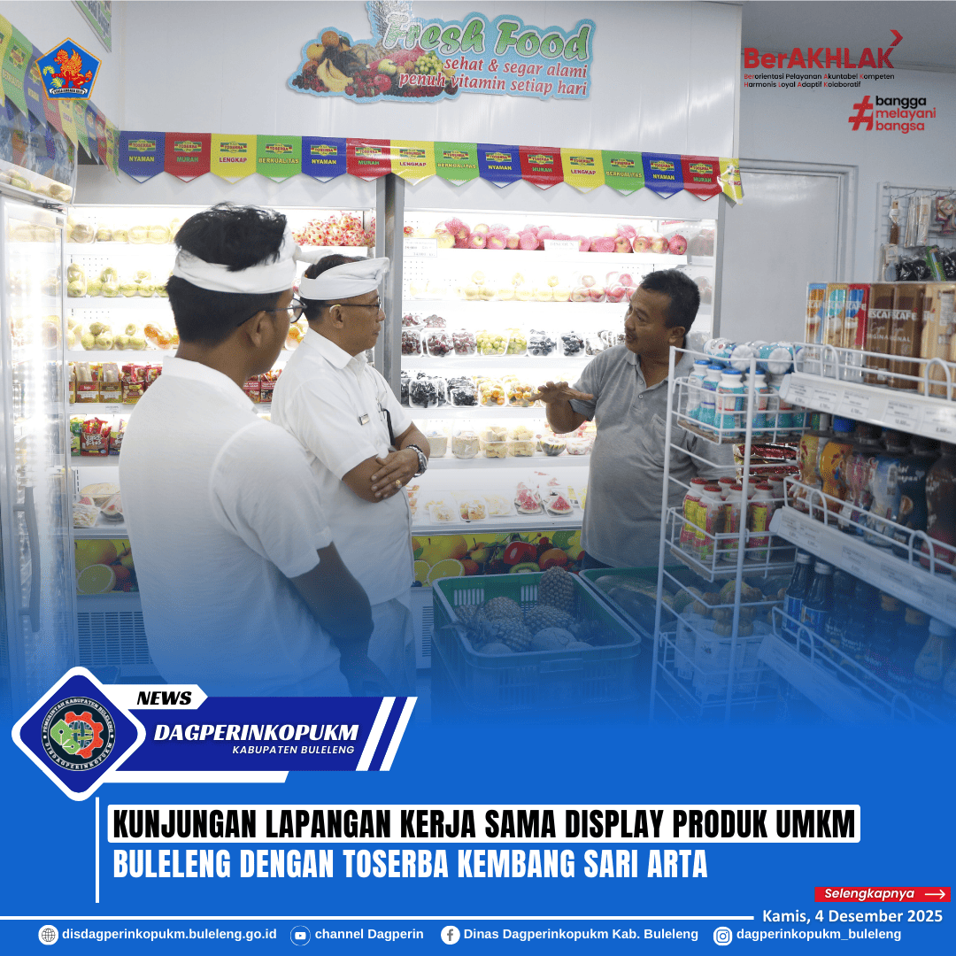 Kepala Dinas Dagperinkopukm Kabupaten Buleleng Drs. Dewa Made Sudiarta, M.Si bersama Kasubag Umum dan Tenaga Pendamping UPTD PLUT KUMKM Buleleng melaksanakan kunjungan lapangan sebagai tindaklanjut MOU antara pelaku UMKM dengan retail lokal modern “Toserba KSA” terkait fasilitasi tempat pajangan/etalase produk UMKM di dua lokasi yaitu di Toserta KSA Cabang Udayana dan Toserba KSA Cabang Sangsit, Kamis (4/12).
