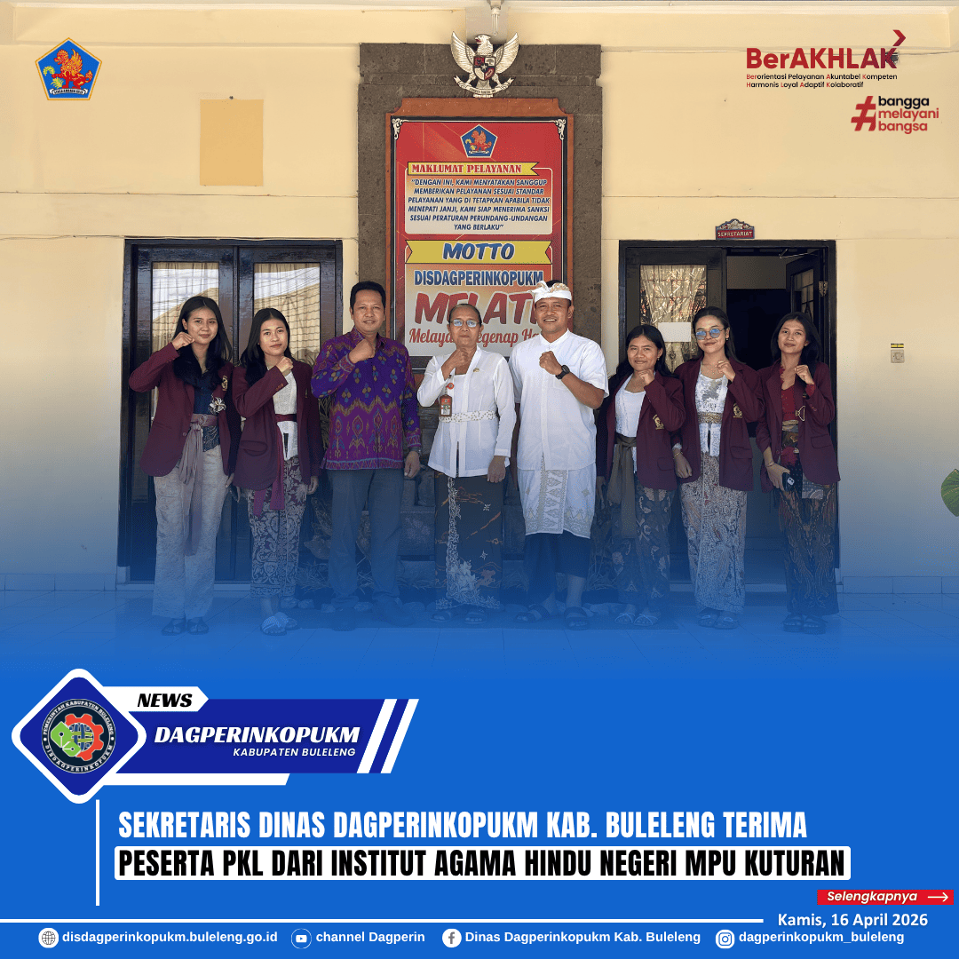 Sekretaris Dinas Perdagangan, Perindustrian, Koperasi, Usaha Kecil dan Menengah Kabupaten Buleleng, I Made Sudarmika, didampingi Kepala Sub Bagian Umum dan Kepegawaian, menerima kedatangan mahasiswa dari Institut Agama Hindu Negeri Mpu Kuturan (IMK) yang akan melaksanakan Program Praktik Kerja Lapangan (PKL) di lingkungan Dinas Dagperinkopukm Kabupaten Buleleng.