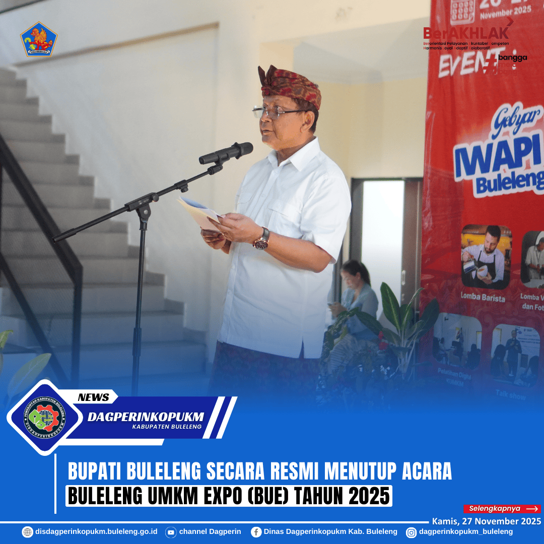 Bupati Buleleng I Nyoman Sutjidra secara resmi menutup acara Buleleng UMKM Expo (BUE) Tahun 2025 yang sudah berlangsung selama 2 hari, mulai dari tanggal 26 s/d 27 November 2025. Penutupan acara berlangsung di Gedung Pusat Layanan Usaha Terpadu (PLUT) KUMKM Buleleng pada, Kamis (27/11).