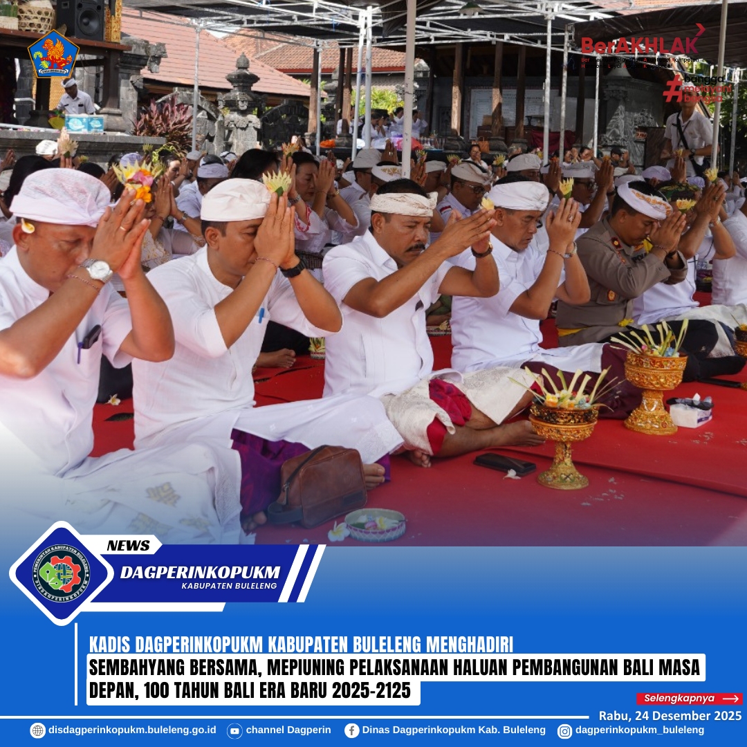 Kepala Dinas Perdagangan Perindustrian dan Koperasi, Usaha Kecil dan Menengah Kabupaten Buleleng Drs. Dewa Made Sudiarta, M.Si menghadiri Persembahyangan bersama sekaligus mepiuning dalam rangka Pelaksanaan Haluan Pembangunan Bali Masa Depan, 100 Tahun Bali Era Baru 2025-2125 bertempat di Pura Jagatnatha Buleleng pada hari Rabu (24/12).