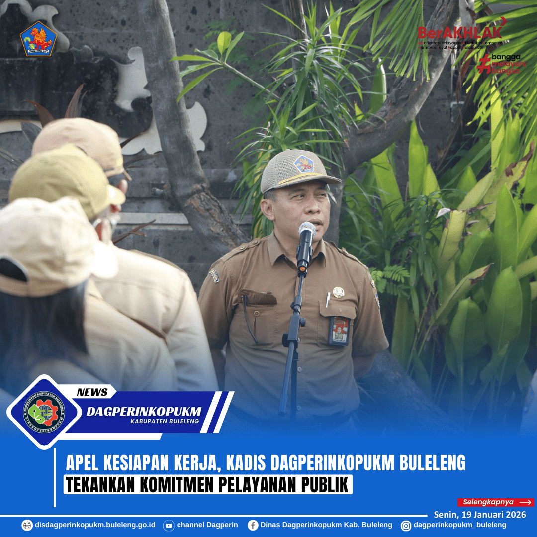 Apel Kesiapan Kerja Dinas Perdagangan, Perindustrian, Koperasi, Usaha Kecil dan Menengah (Dagperinkopukm) Kabupaten Buleleng dilaksanakan di halaman Kantor Dinas Dagperinkopukm Kabupaten Buleleng, Senin (19/1). Apel kesiapan kerja ini bertujuan untuk meneguhkan kembali komitmen dan kedisiplinan aparatur dalam menjalankan tugas dan fungsi pelayanan kepada masyarakat