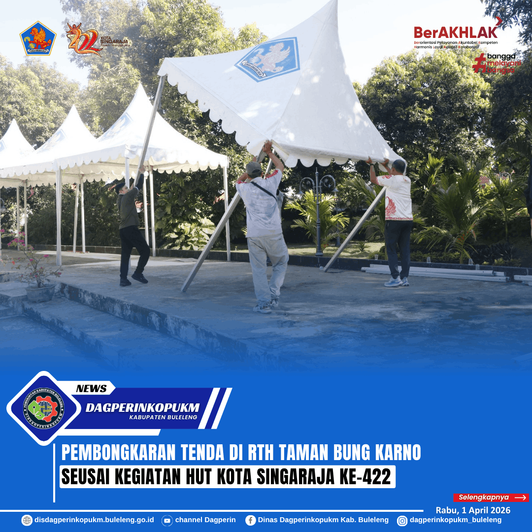 Pembongkaran tenda di RTH Taman Bung Karno menjadi penanda berakhirnya rangkaian Pameran UMKM dalam perayaan HUT Kota Singaraja ke-422, Rabu (1/4).