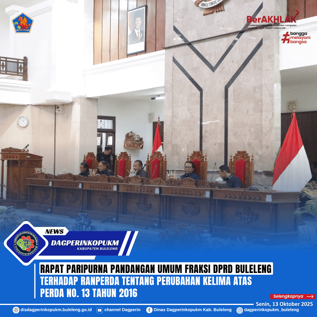 Sekretaris Dinas Perdagangan, Perindustrian dan Koperasi, Usah Kecil dan Menengah (DagperinkopUKM) Kabupaten Buleleng I Made Sudarmika menghadiri Rapat Paripurna Penyampaian Pandangan Umum Fraksi-fraksi DPRD Kabupaten Buleleng terhadap Ranperda tentang Perubahan Kelima atas Perda No. 13 Tahun 2016 tentang Pembentukan dan Susunan Perangkat Daerah. Rapat dilaksanakan di Ruang Sidang Utama DPRD Kabupaten Buleleng, pada Senin (13/10).