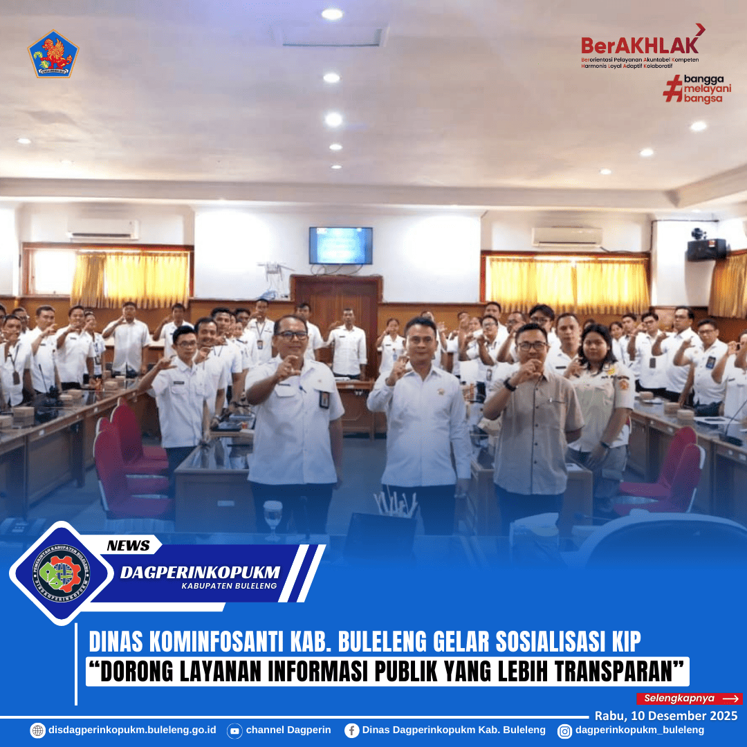 Dalam rangka meningkatkan pemahaman dan implementasi Undang-Undang Nomor 14 Tahun 2008 tentang Keterbukaan Informasi Publik, Dinas Kominfosanti Kabupaten Buleleng menggelar sosialisasi Keterbukan Informasi Publik bagi operator website PPID pada masing-masing SKPD di Kabupaten Buleleng. Kegiatan di laksanakan di Ruang Rapat Unit IV Kantor Bupati Buleleng, Rabu (10/12).