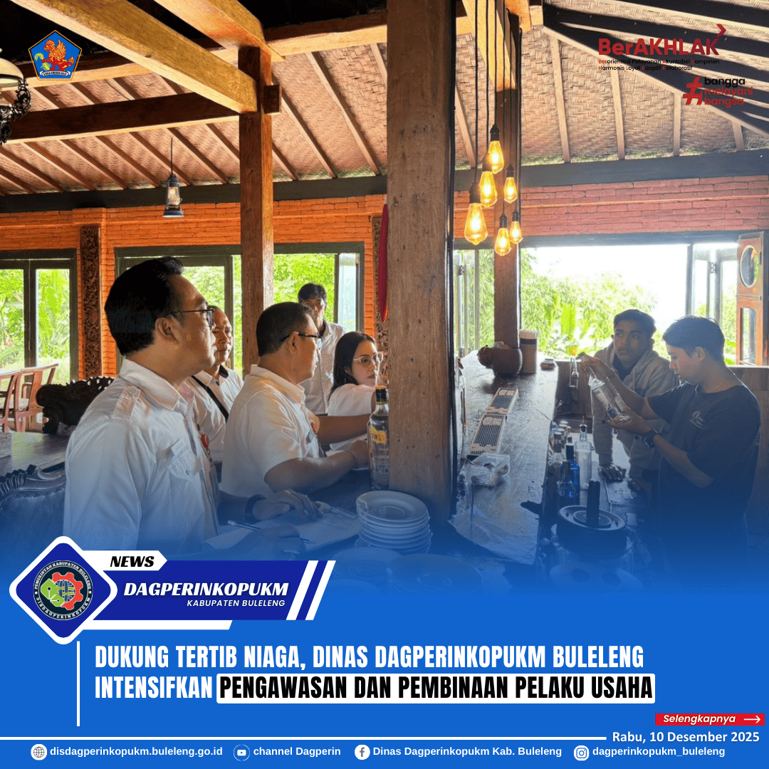 Bidang Sarana Tertib Niaga Perdagangan Dinas Dagperinkopukm Kabupaten Buleleng melakukan kegiatan pengawasan dan pembinaan di sejumlah pelaku usaha sebagai tindak lanjut atas temuan Loka POM Kabupaten Buleleng, pada Rabu (10/12). Kegiatan ini bertujuan memastikan bahwa produk yang beredar memenuhi standar keamanan dan memenuhi ketentuan perundang-undangan. Selain itu, tim juga memfasilitasi permohonan rekomendasi Surat Keterangan Penjual Langsung (SKPL) Minuman Beralkohol Golongan B dan C serta Berita Acara Pemeriksaan Lapangan (BAPL) sebagai bagian dari upaya menjamin tertib niaga dan perlindungan konsumen.