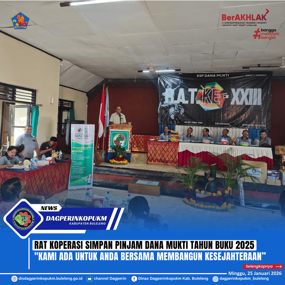 Kepala Dinas Dagperinkopukm Kabupaten Buleleng Dewa Made Sudiarta menghadiri RAT Koperasi Simpan Pinjam Dana Mukti Ke-XXIII Tahun Buku 2025 yang bertempat di Gedung Dekopinda Buleleng, Minggu 25 Januari 2026. Kegiatan ini menjadi momentum penting bagi koperasi dalam kehidupan berkoperasi sebagaimana diamanatkan dalam Undang Undang Nomor 25 Tahun 1992 tentang perkoperasian serta Permenkopukm RI Nomor : 19/Per/M.KUKM/IX/2015 Tahun 2015 tentang Penyelenggaraan Rapat Anggota Koperasi, Pengurus mempertanggungjawabkan kinerja serta pengawas mempertanggungjawabkan kepengawasannya selama Tahun Buku 2025 sekaligus memperkuat komitmen pelayanan kepada seluruh anggota sehingga keberadaan koperasi dirasakan menfaatnya.