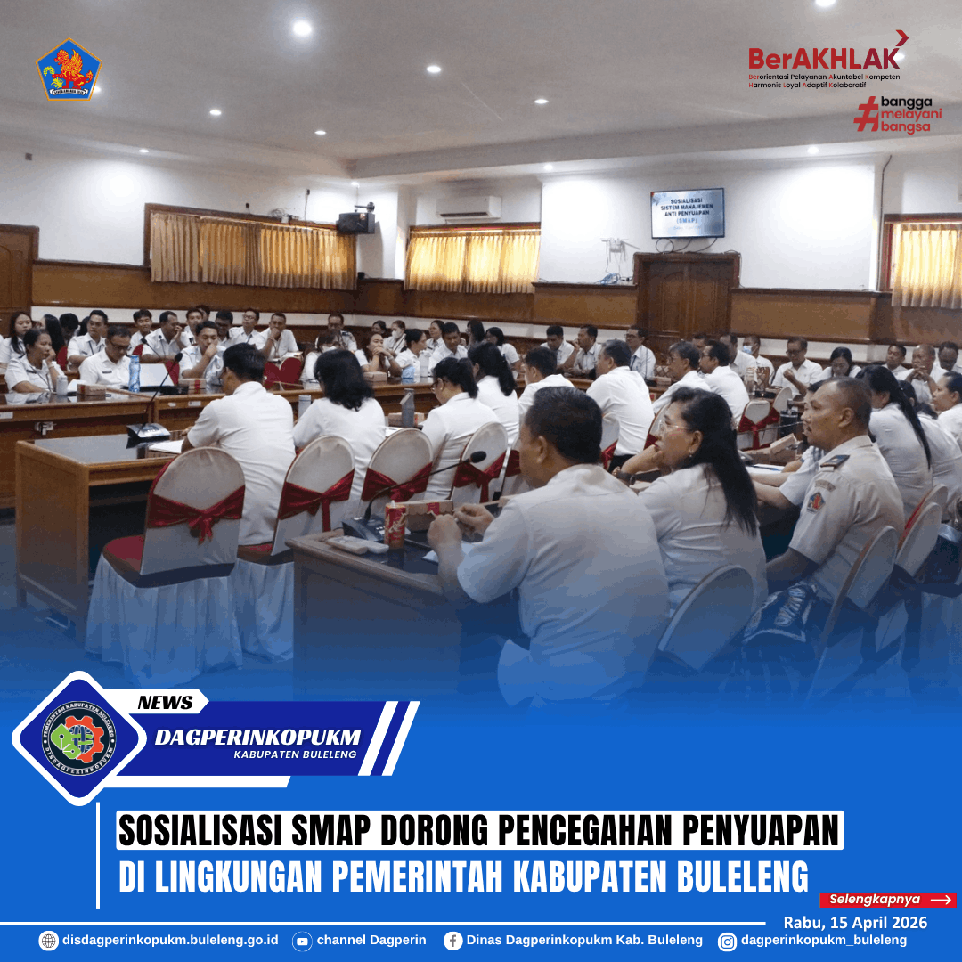 Sekretaris Dinas Perdagangan, Perindustrian, Koperasi, Usaha Kecil dan Menengah Kabupaten Buleleng, I Made Sudarmika, Menghadiri undangan pemahaman implementasi Sistem Manajemen Anti Penyuapan (SMAP) di lingkungan Pemerintah Kabupaten Buleleng, telah dilaksanakan kegiatan Sosialisasi SMAP pada Rabu, 15 April 2026, yang dibuka secara resmi oleh Sekretaris Daerah Kabupaten Buleleng, Drs. Gede Suyasa, M.Pd, bertempat di Ruang Rapat Unit IV Sekretariat Daerah Kabupaten Buleleng.