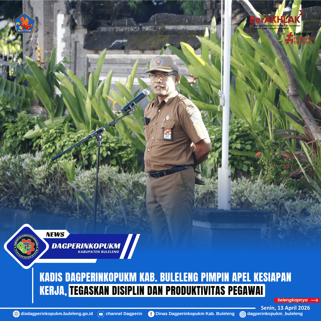 Senin, 13 April 2026 - Apel kesiapan kerja Dinas Perdagangan, Perindustrian, Koperasi, Usaha Kecil dan Menengah Kabupaten Buleleng, dipimpin oleh Kepala Dinas, Drs. Dewa Made Sudiarta, M.Si, serta diikuti oleh seluruh pegawai. Kegiatan ini menjadi momentum penting untuk memastikan kesiapan kinerja seluruh jajaran dalam memasuki triwulan II.