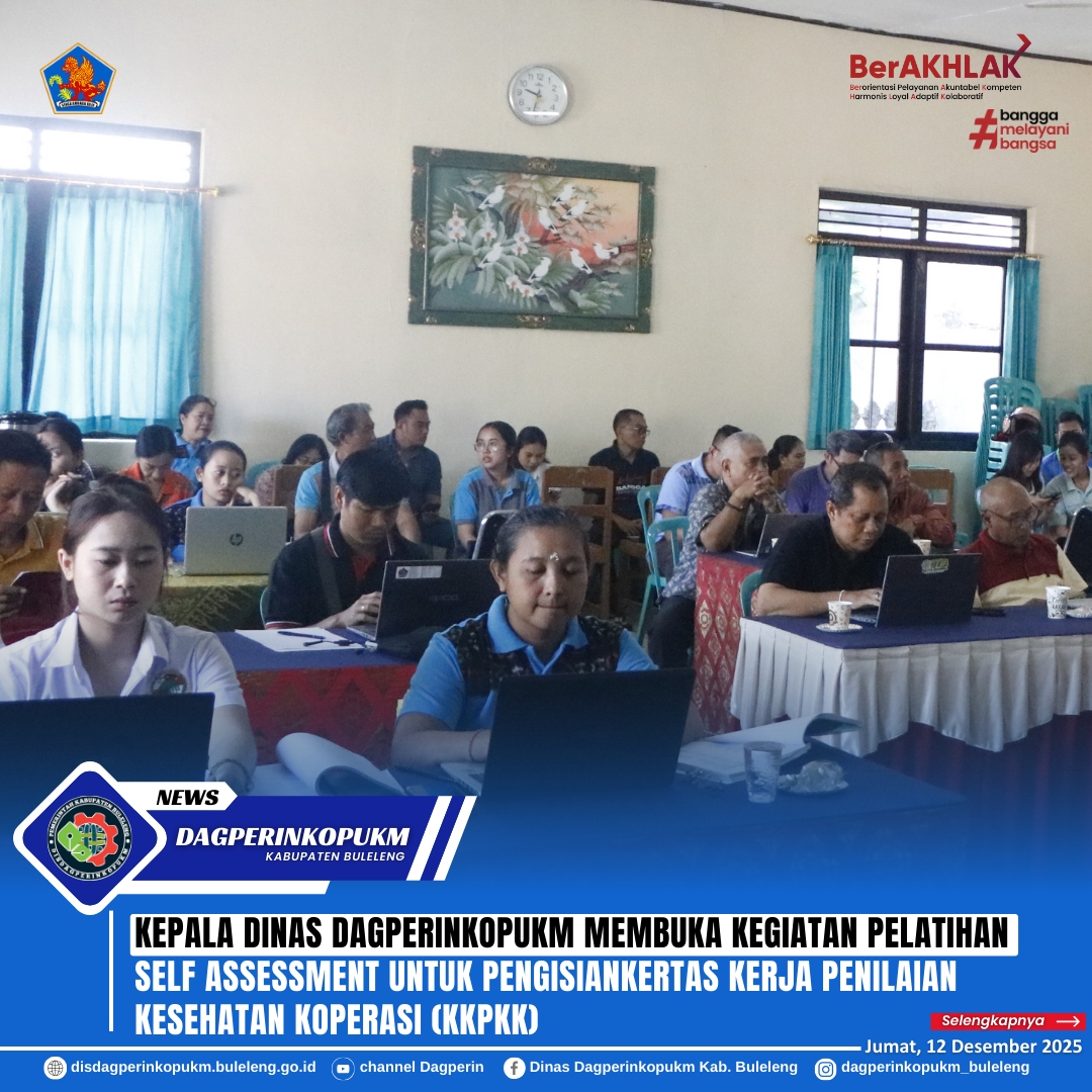 Kepala Dinas Dagperinkopukm Kabupaten Buleleng Drs. Dewa Made Sudiarta, M.Si. menghadiri sekaligus membuka kegiatan Self Assessment untuk pengisian Kertas Kerja Penilaian Kesehatan Koperasi (KKPKK) di Gedung Dekopinda Kabupaten Buleleng pada hari Jumat (12/12)