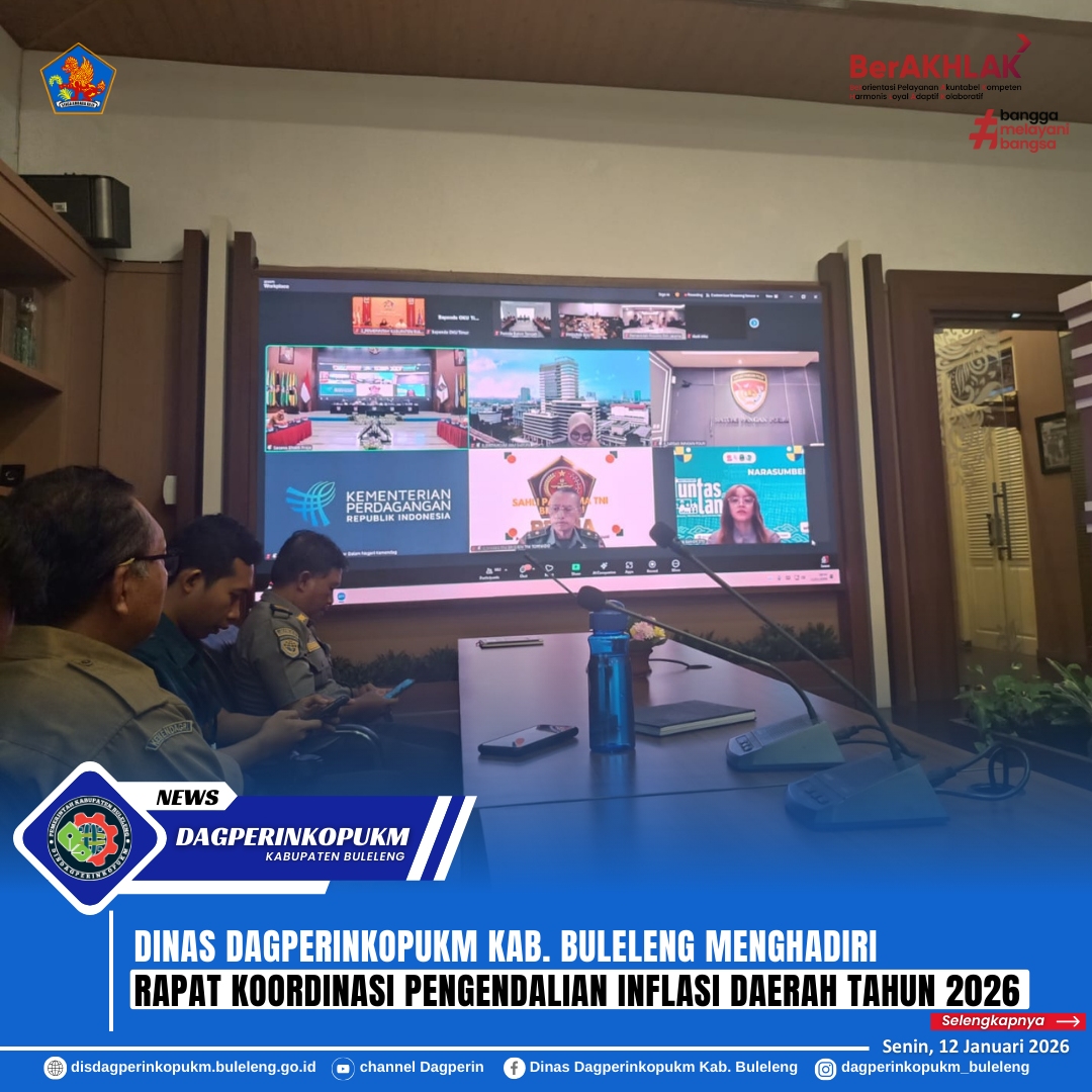 Buleleng, 12 Januari 2026 - Kepala Dinas Dinas Perdagangan, Perindustrian, Koperasi dan UKM Kabupaten Buleleng Dewa Made Sudiarta, didampingi oleh Kepala Bidang Pengembangan Perdagangan Made Mira Tri Yulia Ida Justisiana menghadiri Rapat Koordinasi Pengendalian Inflasi Daerah Tahun 2026 secara daring, bertempat di Lobi Kantor Bupati Buleleng yang dihadiri oleh Tim Pengendali Inflasi Daerah Kabupaten Buleleng.