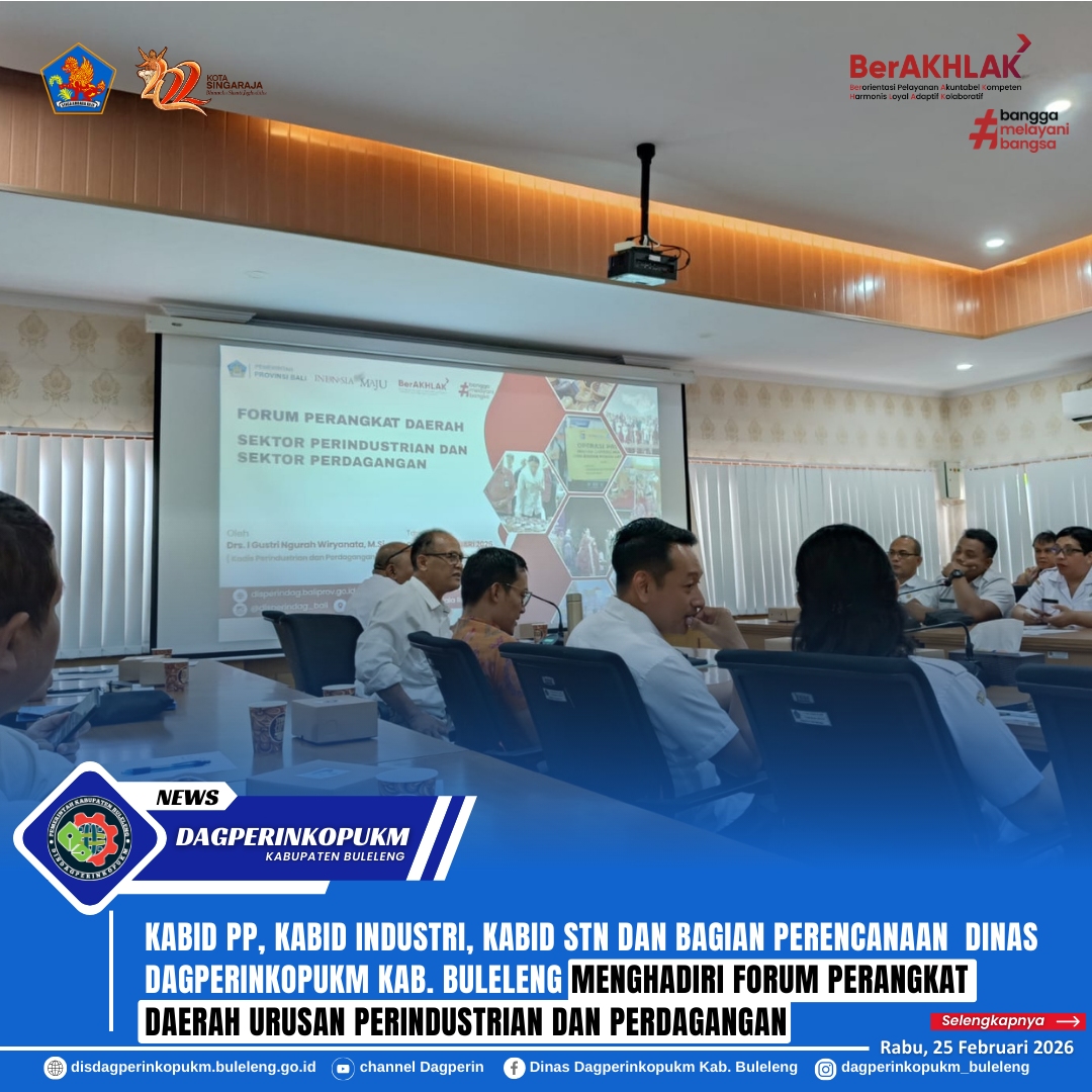 Bali, Rabu, 25 Februari 2026 - Kepala Bidang Pengembangan Perdagangan, Kepala Bidang Sarana Tertib Niaga, Kepala Bidang Industri, dan Perencana Ahli Madya Dinas Perdagangan, Perindustrian, Koperasi, Usaha Kecil dan Menengah Kabupaten Buleleng menghadiri Forum Perangkat Daerah Urusan Perindustrian dan Perdagangan yang berlokasi di Kantor Disperindag Provinsi Bali hari Rabu (25/2). Kegiatan ini dilaksanakan dalam rangka Penyusunan Rancangan Awal RKPD Semesta Berencana Tahun 2027.