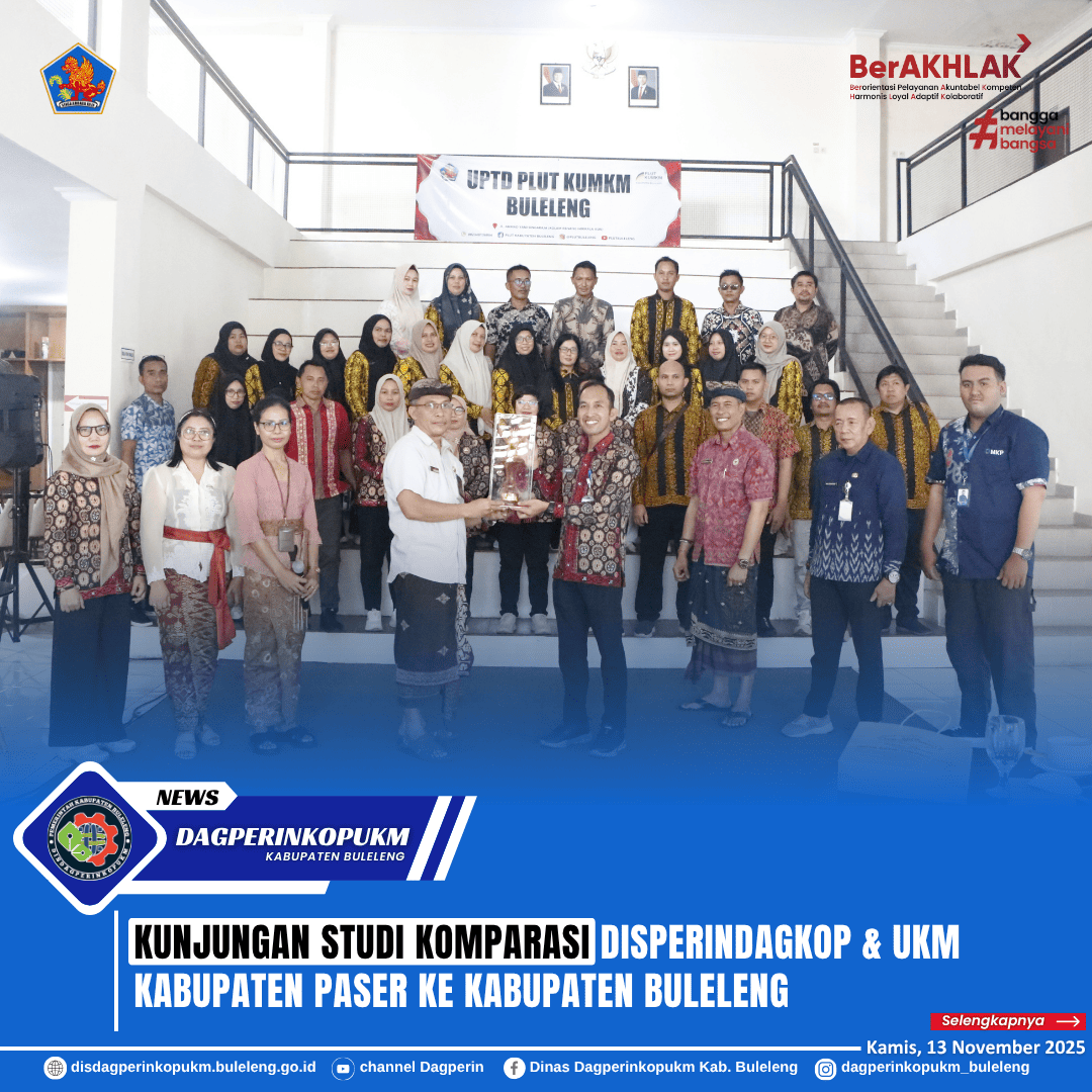 Kepala Dinas Perdagangan, Perindustrian dan Koperasi, Usaha Kecil dan Menengah (Dagperinkopukm) Kabupaten Buleleng Dewa Made Sudiarta menerima kunjungan dari Dinas Perindustrian, Perdagangan dan Koperasi & UKM Kabupaten Paser, Provinsi Kalimantan Timur. Rombongan diterima di Gedung Pusat Layanan Usaha Terpadu (PLUT) KUMKM Kabupaten Buleleng, pada Kamis (13/11).