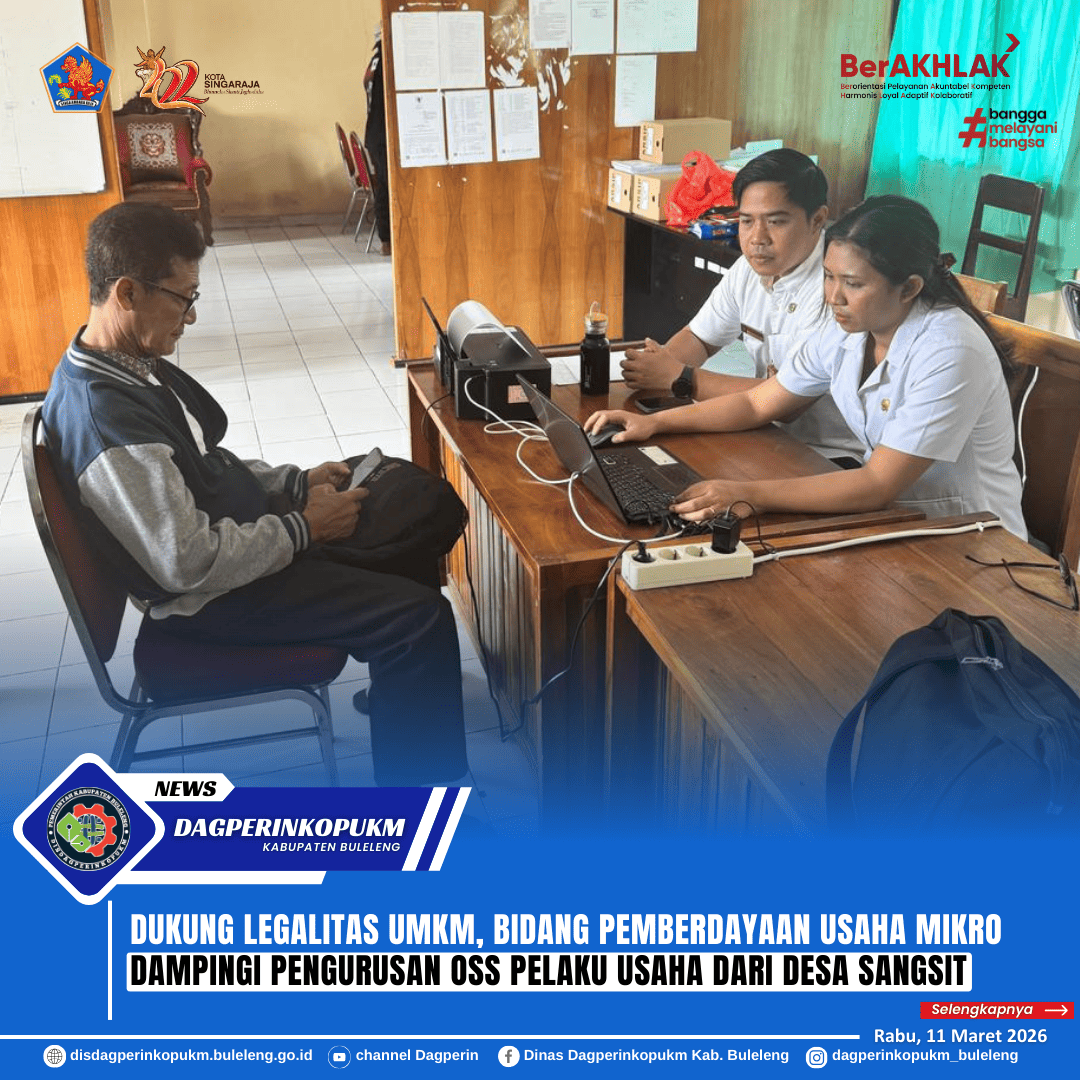 Singaraja, 11 Maret 2026 - Bidang Pemberdayaan Usaha Mikro melaksanakan pendampingan langsung kepada pelaku usaha dalam proses pengurusan legalitas usaha melalui sistem Online Single Submission (OSS). Kegiatan ini merupakan bagian dari upaya pemerintah daerah dalam membantu pelaku UMKM agar memiliki legalitas usaha yang jelas dan dapat mengakses berbagai program pengembangan usaha.