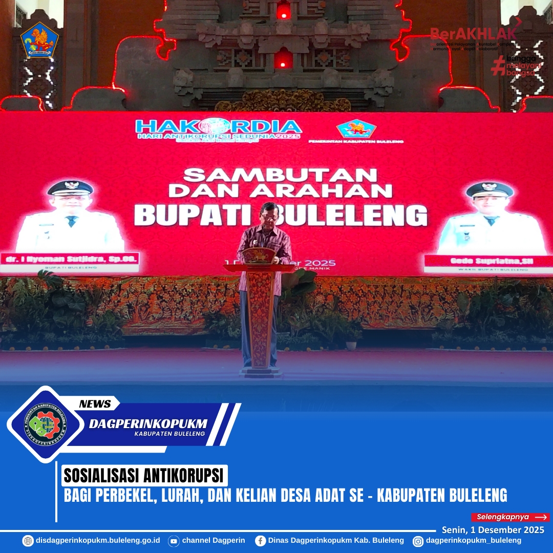 Dalam rangka memperingati Hari Anti Korupsi Seduania (Hakordia), Kabupaten Buleleng menggelar acara sosialisasi antikorupsi kepada Lurah, Perbekel, dan Kelian Desa Adat se-Kabupaten Buleleng bertempat di Gedung Kesenian Gde Manik Singaraja, Senin (1/12).