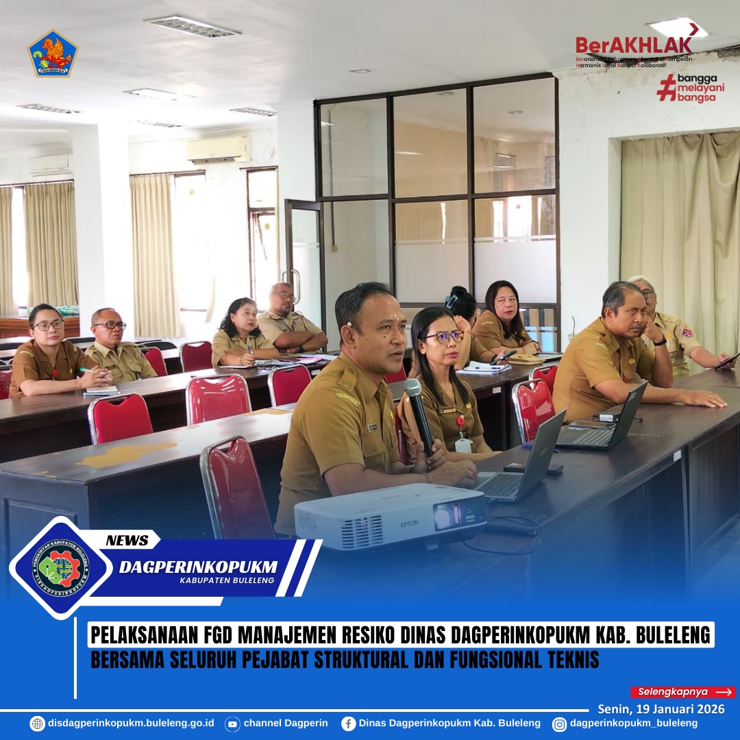 Buleleng, 19 Januari 2026 - Kepala Dinas Perdagangan Perindustrian Koperasi Usaha Kecil dan Menengah Kabupaten Buleleng Bapak Dewa Made Sudiarta melaksanakan FGD Manajemen Resiko bersama seluruh Pejabat Struktural dan Fungsional Teknis bertempat di ruang rapat Dinas Dagperinkopukm pada hari Senin (19/1).