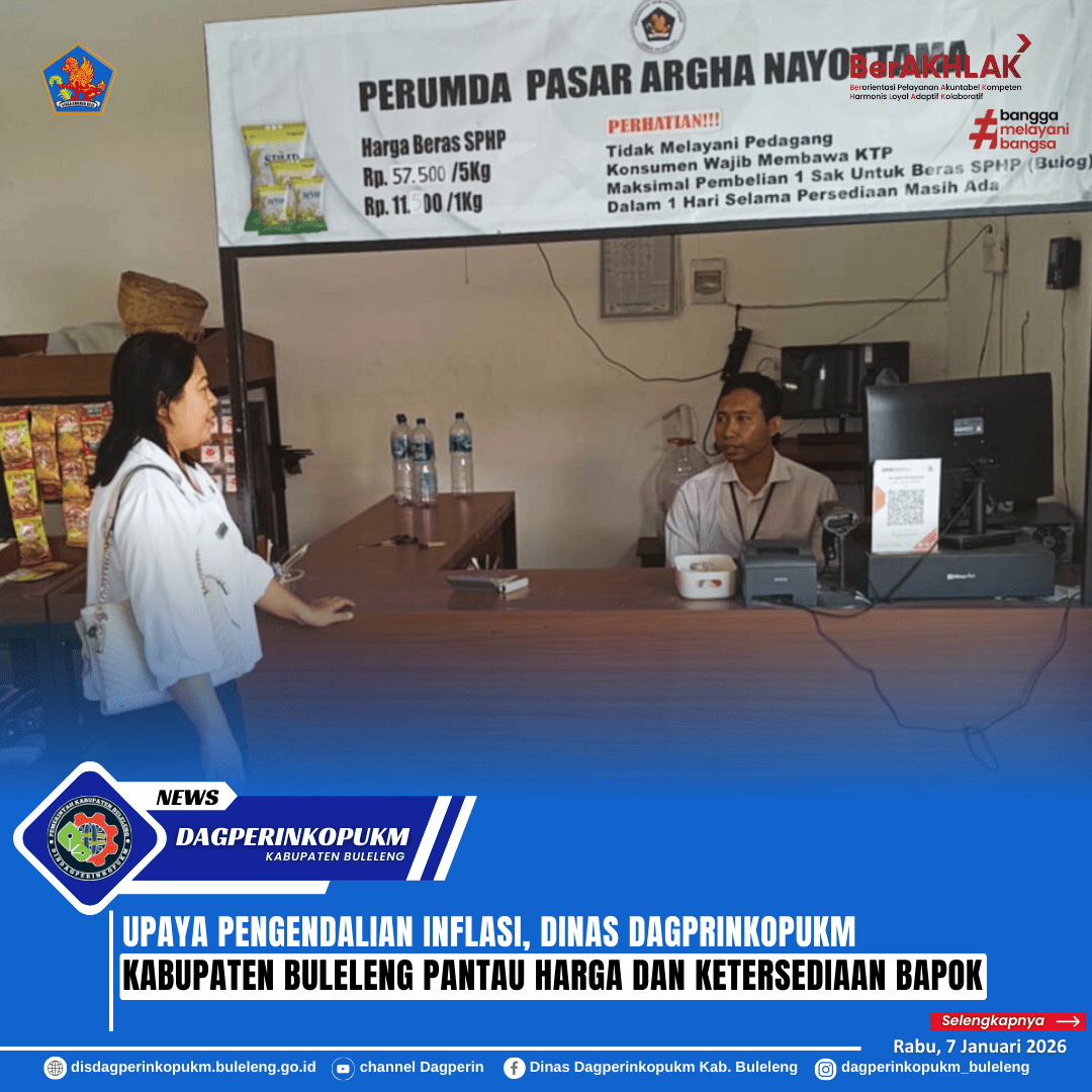 Dalam rangka menindaklanjuti program pengendalian inflasi, yaitu mencegah laju inflasi dan gejolak sosial di Kabupaten Buleleng, Dinas Dagprinkopukm Kabupaten Buleleng melalui Bidang Pengembangan Perdagangan, melaksanakan kegiatan pemantauan harga dan ketersediaan stok barang kebutuhan pokok (bapok) ke pasar kota, gerai pasar perusda dan sub distributor/agen, Rabu (7/1).