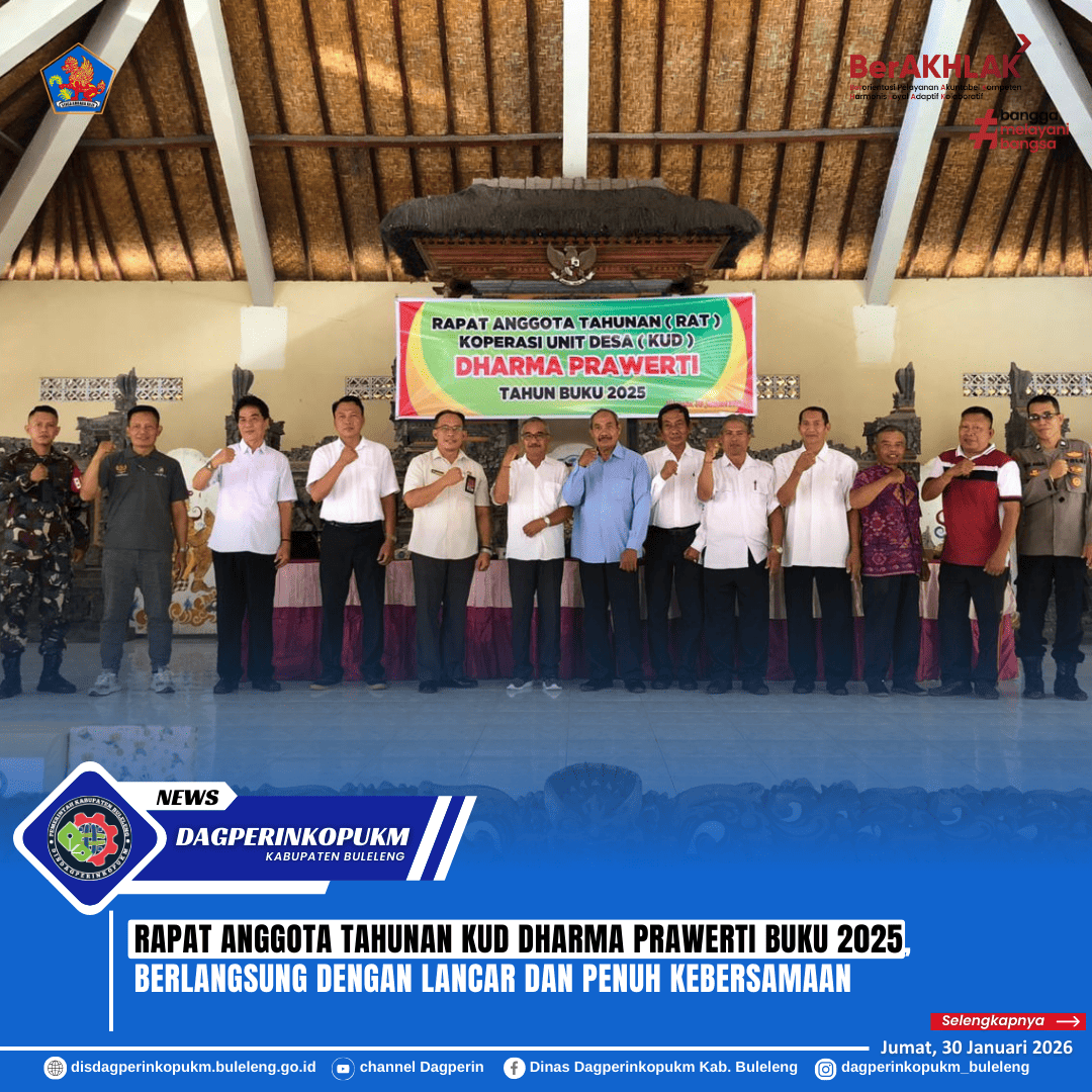 Kepala Dinas Dagperinkopukm Kabupaten Buleleng Dewa Made Sudiarta menghadiri undangan Rapat Anggota Tahunan atau RAT KUD Dharma Prawerti Tahun Buku 2025 yang dilaksanakan di Balai Desa Serba Guna Widu Sabha Budaya, Desa Tejakula, Jumat (30/1). RAT KUD Dharma Prawerti kali ini dihadiri oleh Ketua PUSKUD Bali Dwipa, Ketua Dekopinda Kabupaten Buleleng, Bapak Camat Tejakula, unsur Muspika Kecamatan Tejakula, serta para Perbekel se-Kecamatan Tejakula.