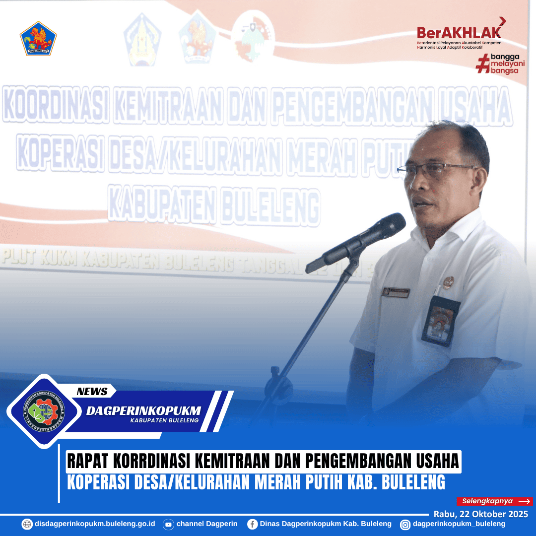 Dalam rangka percepatan operasional Koperasi Desa/Kelurahan Merah Putih (KDKMP) di Kabupaten Buleleng, Dinas Dagperinkopukm Kabupaten Buleleng melaksanakan rapat koordinasi kemitraan dan pengembangan usaha Koperasi Desa/Kelurahan Merah Putih di Kabupaten Buleleng. Rakor dilaksanakan di Gedung Pusat Layanan Usaha Terpadu (PLUT) KUMKM Kabupaten Buleleng, Rabu (22/10).