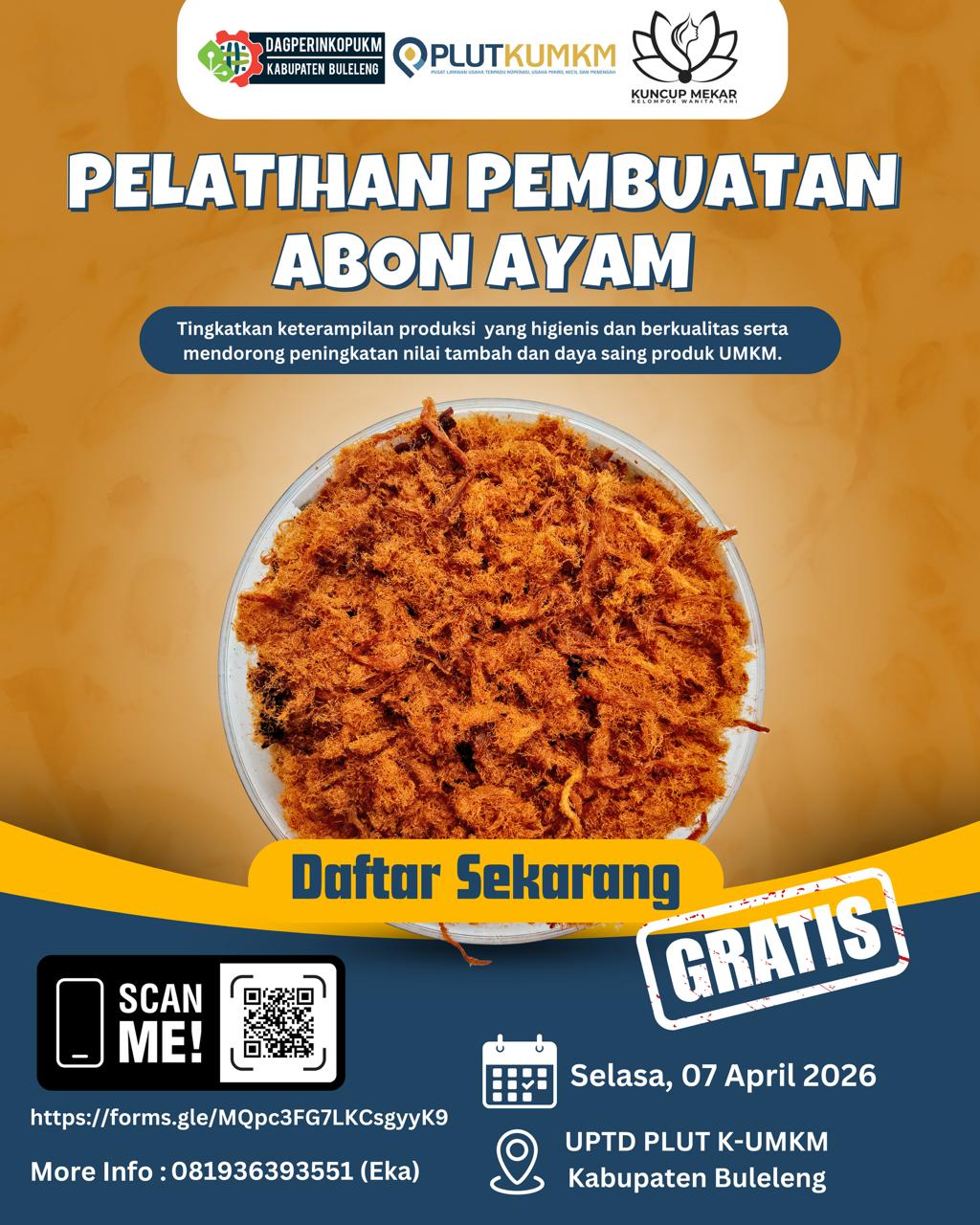 Komitmen mendukung UMKM naik kelas terus kami wujudkan! Kini hadir Pelatihan Pembuatan Abon Ayam untuk membuka peluang usaha yang lebih luas.